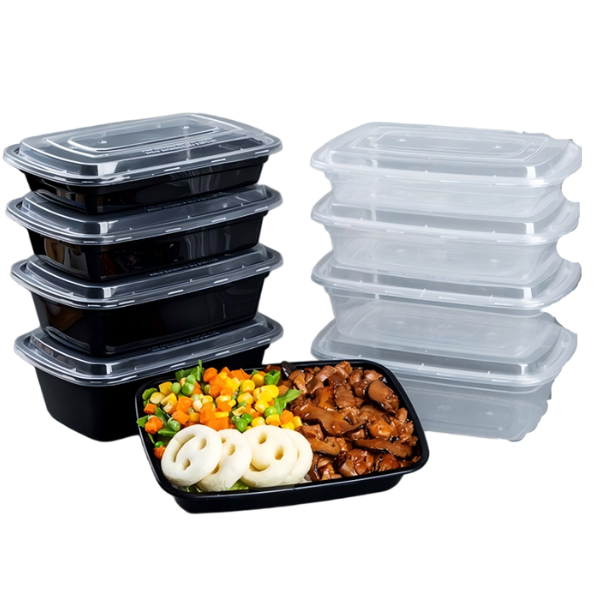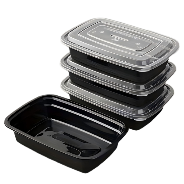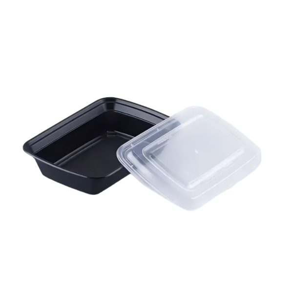 Premium 750ml plastic rectangular containers with black base and matching lids. Leak-proof, microwave-safe, ideal for takeout, meal prep and catering. Wholesale from China factory, customizable options available!