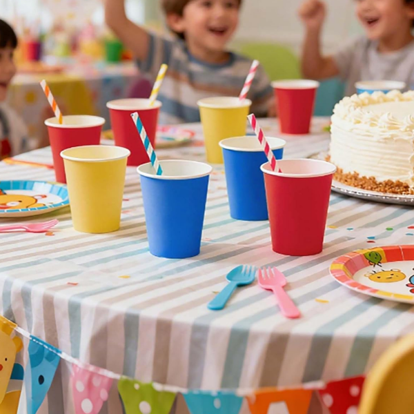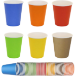 Vibrant colorful 8oz compostable paper cups for Caribbean businesses. Food-safe, sturdy for hot & cold drinks. Small orders welcome. Request your wholesale quote today.