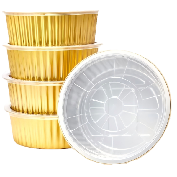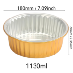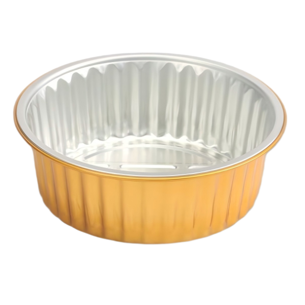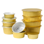Sturdy gold heavy duty aluminum foil containers, great for fast food, takeout and catering purposes.