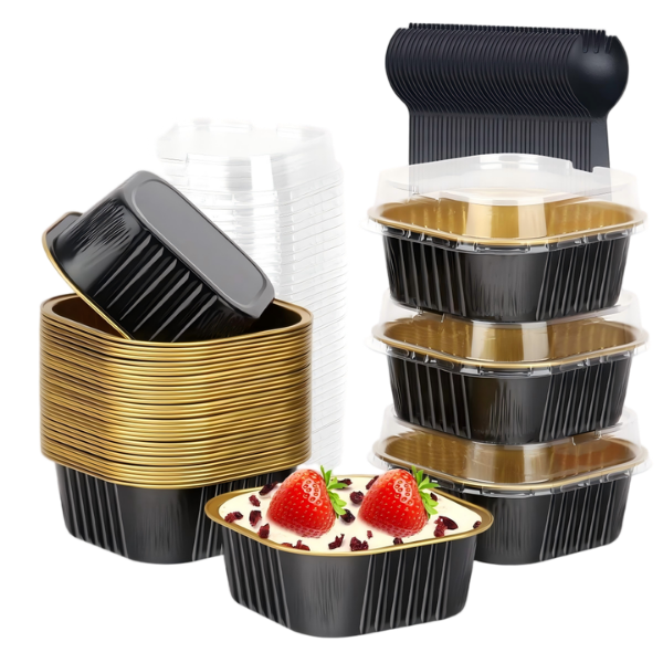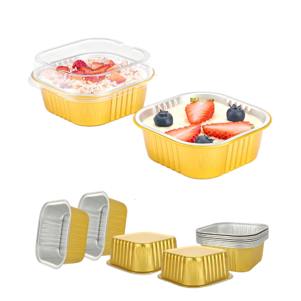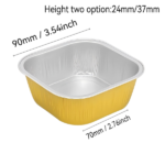 3.5oz (100ml) & 6oz (180ml) square aluminum foil ramekins with lids (90×90mm). Food-grade, heat-resistant gold baking cups ideal for commercial bakery, catering and wholesale.